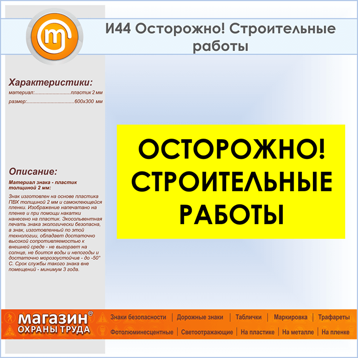 Знак «Осторожно! Строительные работы», И44 (пластик, 600х300 мм) в Бердске купить