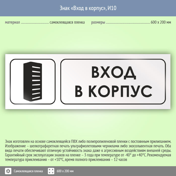 Знак «Вход в корпус», И10 (пленка, 600х200 мм) в Бердске купить