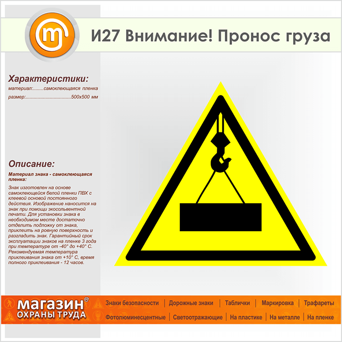 Знак «Внимание! Пронос груза», И27 (пленка, сторона 500 мм) в Бердске купить