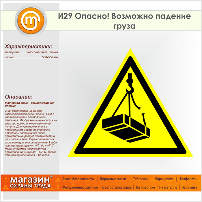 Знак «Опасно! Возможно падение груза», И29 (пленка, сторона 500 мм) в Бердске купить