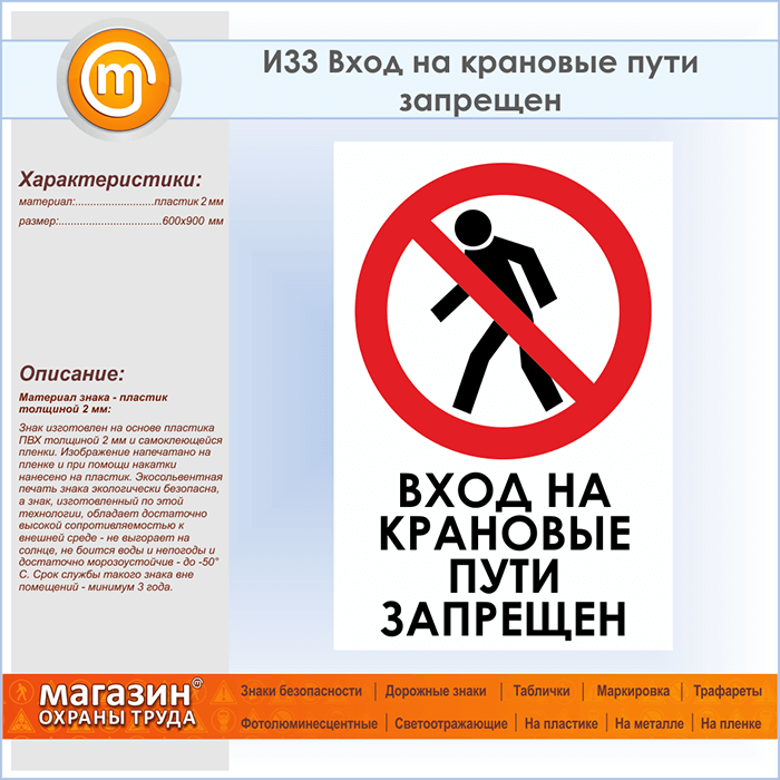 Знак «Вход на крановые пути запрещен», И33 (пластик, 600х900 мм) в Бердске купить