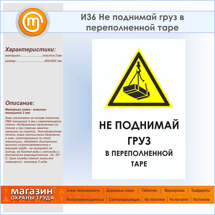 Знак «Не поднимай груз в переполненной таре», И36 (пластик, 600х900 мм) в Бердске купить