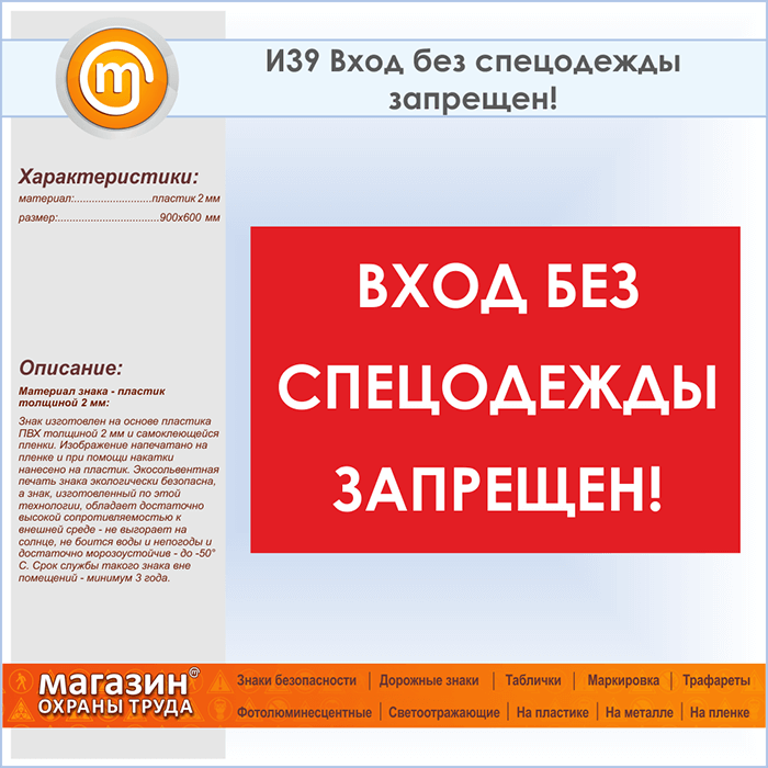 Знак «Вход без спецодежды запрещен!», И39 (пластик, 900х600 мм) в Бердске купить