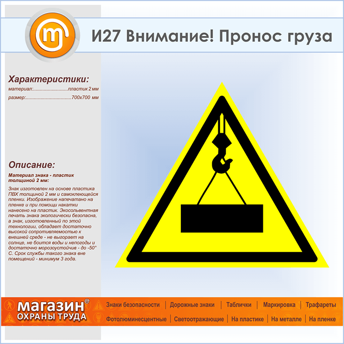 Знак «Внимание! Пронос груза», И27 (пластик, сторона 700 мм) в Бердске купить