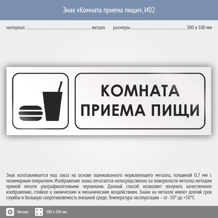 Знак «Комната приема пищи», И02 (металл, 300х100 мм) в Бердске купить