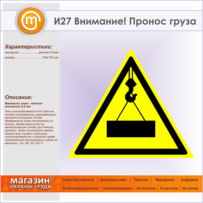 Знак «Внимание! Пронос груза», И27 (металл, сторона 700 мм) в Бердске купить