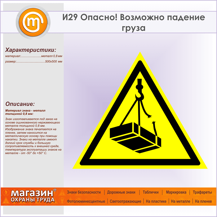 Знак «Опасно! Возможно падение груза», И29 (металл, сторона 500 мм) в Бердске купить