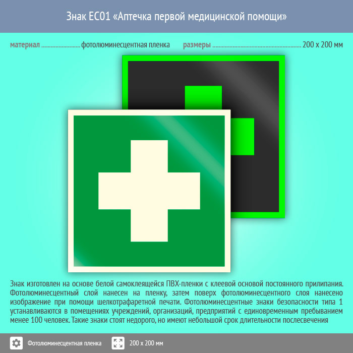 Знак EC01 «Аптечка первой медицинской помощи» (фотолюминесцентная пленка, 200х200 мм) в Бердске купить