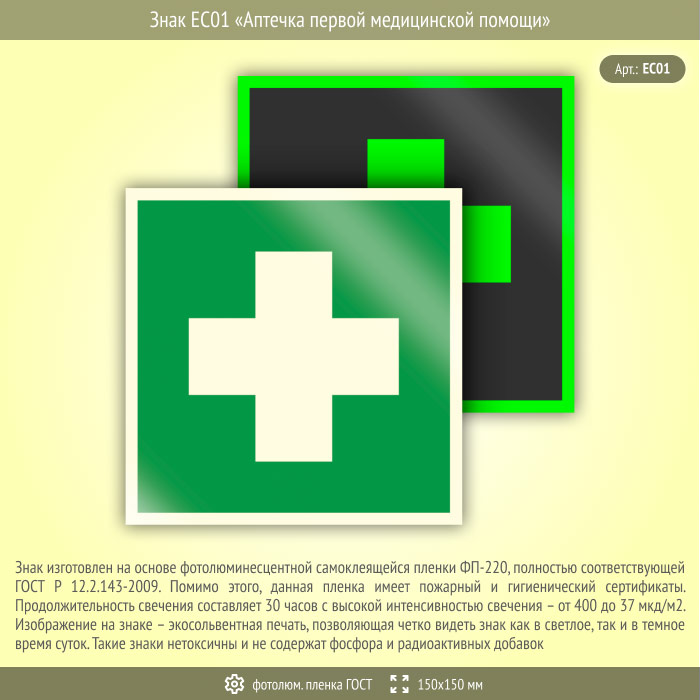 Знак EC01 «Аптечка первой медицинской помощи» (фотолюминесцентная пленка ГОСТ 34428-2018, 150х150 мм) в Бердске купить