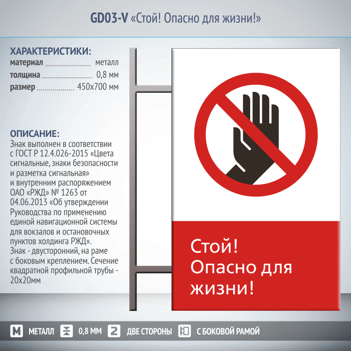 Знак «Стой! Опасно для жизни!», GD03-V (двусторонний вертикальный, 450х700 мм, металл, на раме с боковым креплением) в Бердске купить