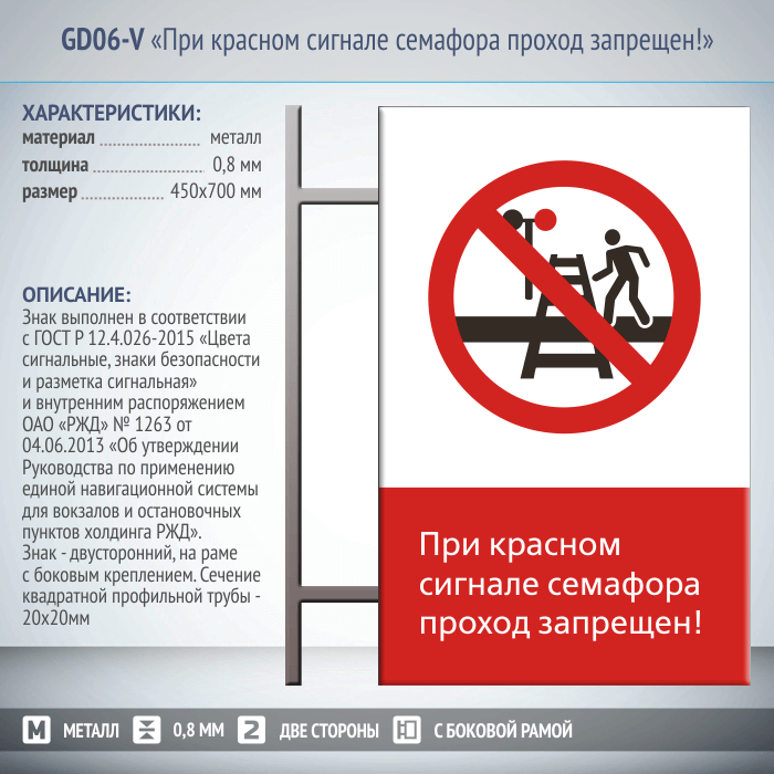 Знак «При красном сигнале семафора проход запрещен!», GD06-V (двусторонний вертикальный, 450х700 мм, металл, на раме с боковым креплением) в Бердске купить