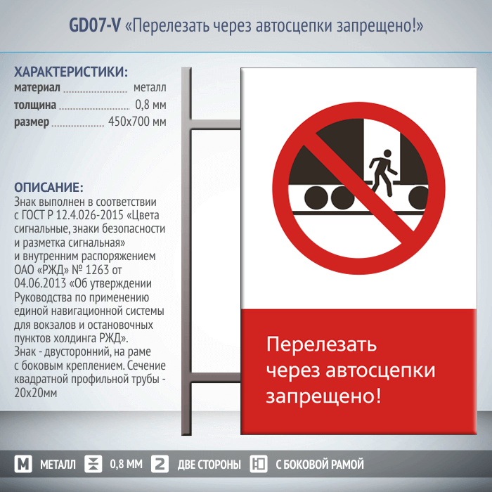 Знак «Перелезать через автосцепки запрещено!», GD07-V (двусторонний вертикальный, 450х700 мм, металл, на раме с боковым креплением) в Бердске купить