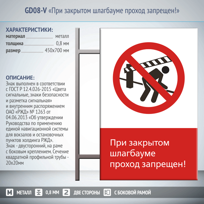 Знак «При закрытом шлагбауме проход запрещен!», GD08-V (двусторонний вертикальный, 450х700 мм, металл, на раме с боковым креплением) в Бердске купить