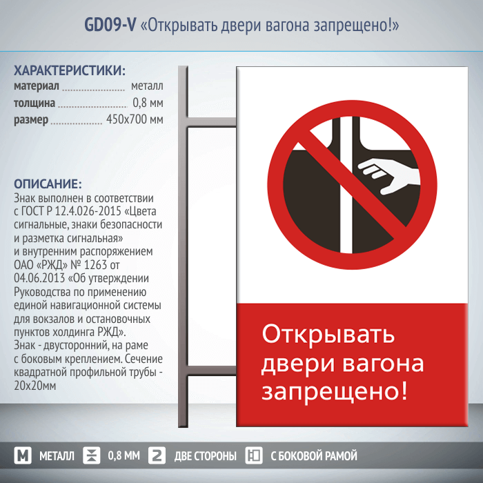 Знак «Открывать двери вагона запрещено!», GD09-V (двусторонний вертикальный, 450х700 мм, металл, на раме с боковым креплением) в Бердске купить