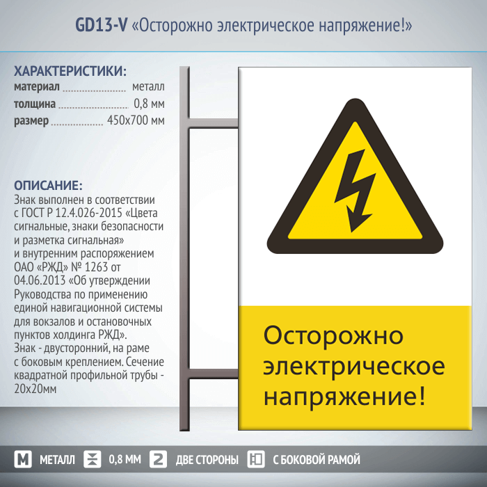 Знак «Осторожно электрическое напряжение!», GD13-V (двусторонний вертикальный, 450х700 мм, металл, на раме с боковым креплением) в Бердске купить