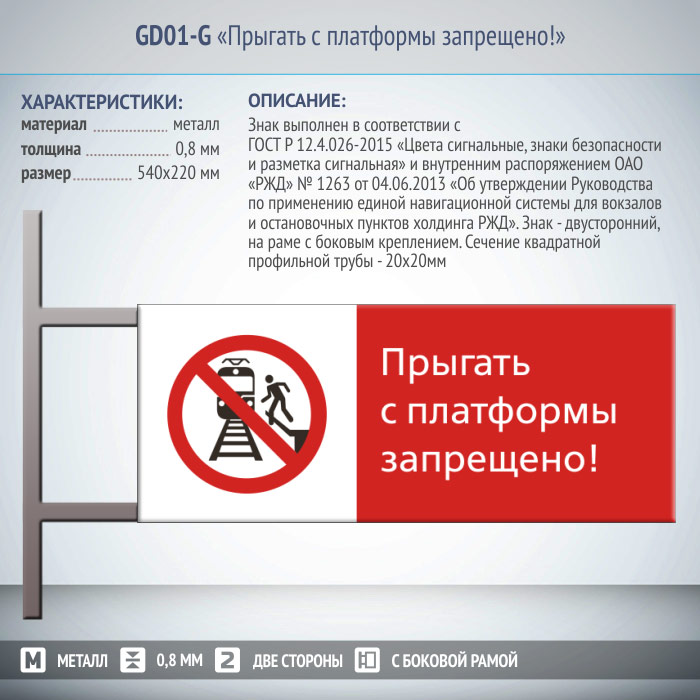Знак «Прыгать с платформы запрещено!», GD01-G (двусторонний горизонтальный, 540х220 мм, металл, на раме с боковым креплением) в Бердске купить