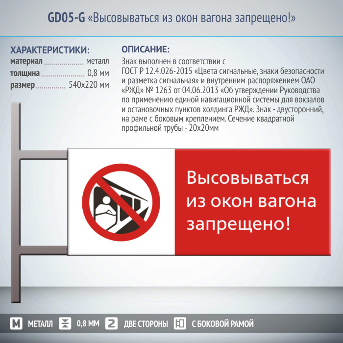 Знак «Высовываться из окон вагона запрещено!», GD05-G (двусторонний горизонтальный, 540х220 мм, металл, на раме с боковым креплением) в Бердске купить