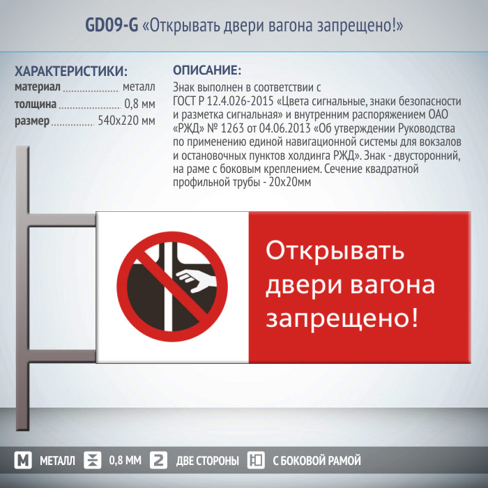 Знак «Открывать двери вагона запрещено!», GD09-G (двусторонний горизонтальный, 540х220 мм, металл, на раме с боковым креплением) в Бердске купить