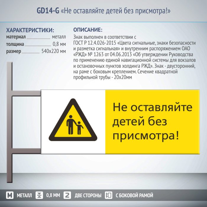 Знак «Не оставляйте детей без присмотра!», GD14-G (двусторонний горизонтальный, 540х220 мм, металл, на раме с боковым креплением) в Бердске купить