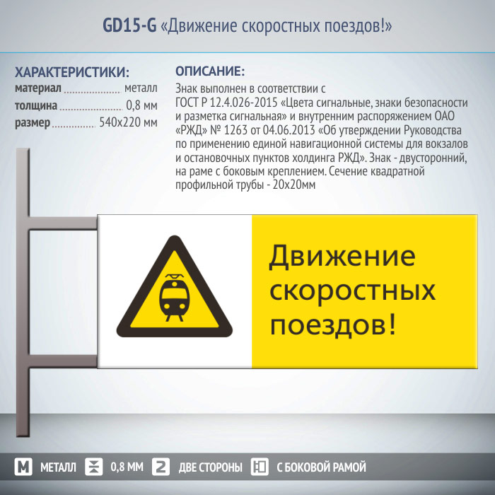 Знак «Движение скоростных поездов!», GD15-G (двусторонний горизонтальный, 540х220 мм, металл, на раме с боковым креплением) в Бердске купить