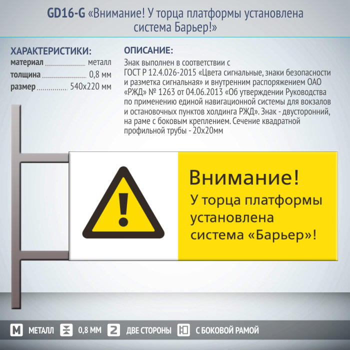 Знак «Внимание! У торца платформы установлена система Барьер!», GD16-G (двусторонний горизонтальный, 540х220 мм, металл, на раме с боковым креплением) в Бердске купить