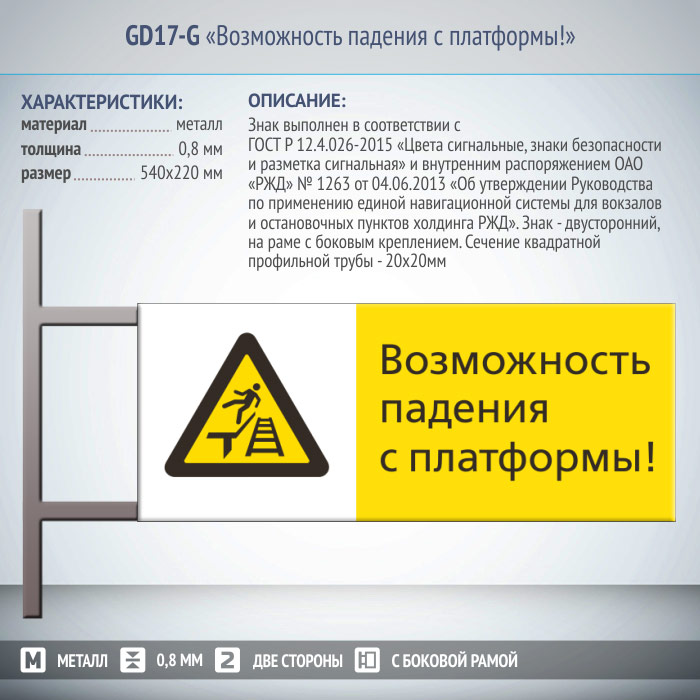 Знак «Возможность падения с платформы!», GD17-G (двусторонний горизонтальный, 540х220 мм, металл, на раме с боковым креплением) в Бердске купить