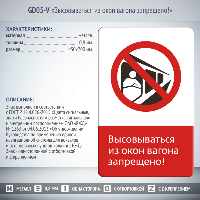 Знак «Высовываться из окон вагона запрещено!», GD05-V (односторонний вертикальный, 450х700 мм, металл, с отбортовкой и Z-креплением) в Бердске купить