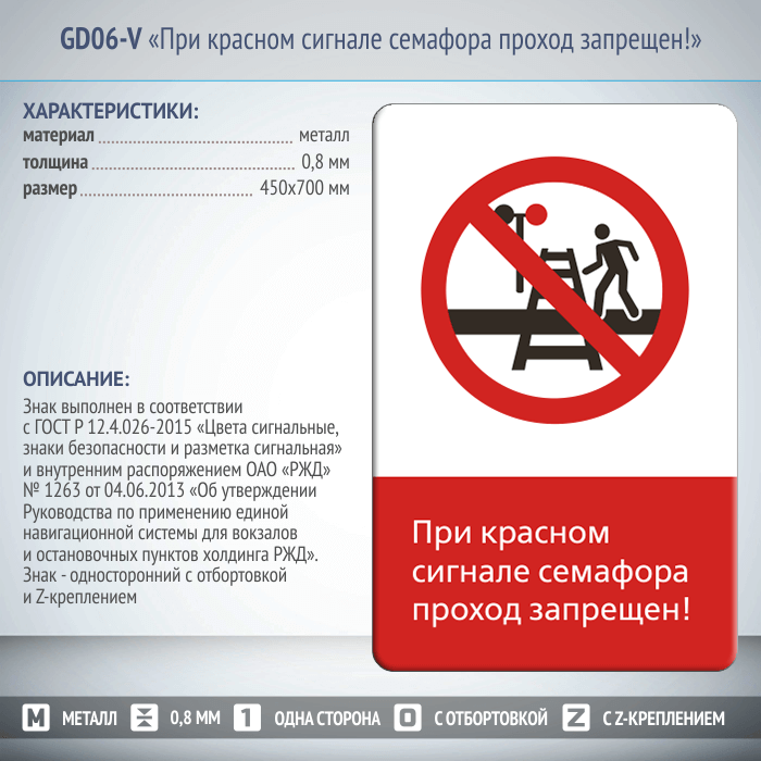 Знак «При красном сигнале семафора проход запрещен!», GD06-V (односторонний вертикальный, 450х700 мм, металл, с отбортовкой и Z-креплением) в Бердске купить