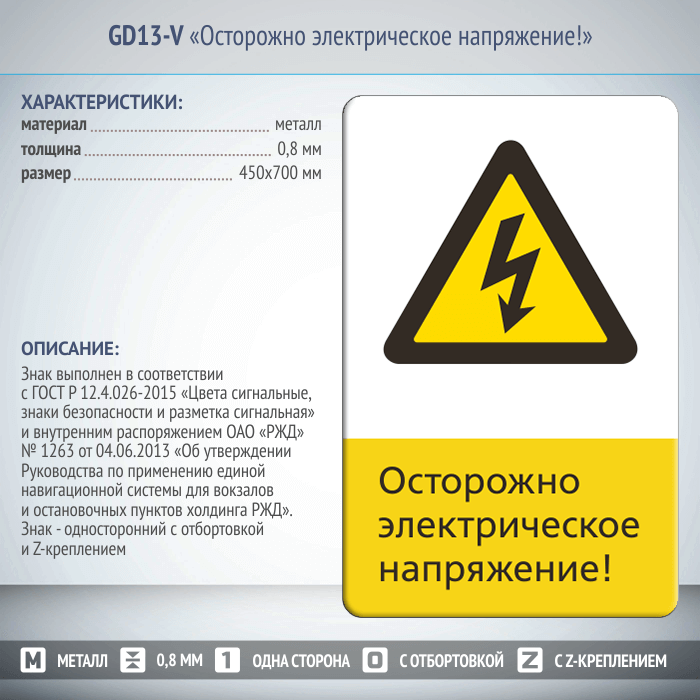 Знак «Осторожно электрическое напряжение!», GD13-V (односторонний вертикальный, 450х700 мм, металл, с отбортовкой и Z-креплением) в Бердске купить