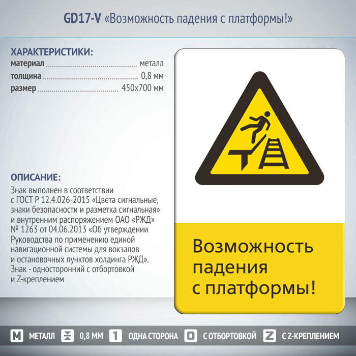 Знак «Возможность падения с платформы!», GD17-V (односторонний вертикальный, 450х700 мм, металл, с отбортовкой и Z-креплением) в Бердске купить