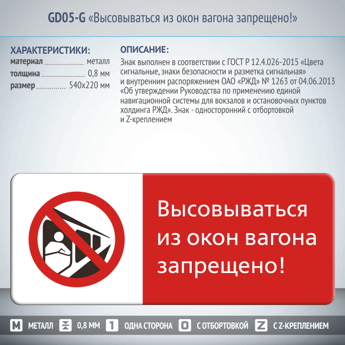 Знак «Высовываться из окон вагона запрещено!», GD05-G (односторонний горизонтальный, 540х220 мм, металл, с отбортовкой и Z-креплением) в Бердске купить