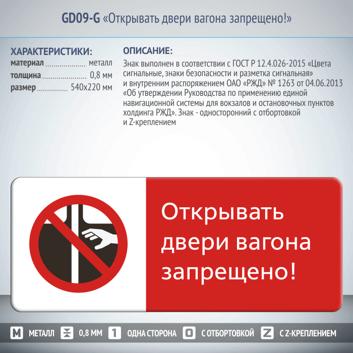 Знак «Открывать двери вагона запрещено!», GD09-G (односторонний горизонтальный, 540х220 мм, металл, с отбортовкой и Z-креплением) в Бердске купить