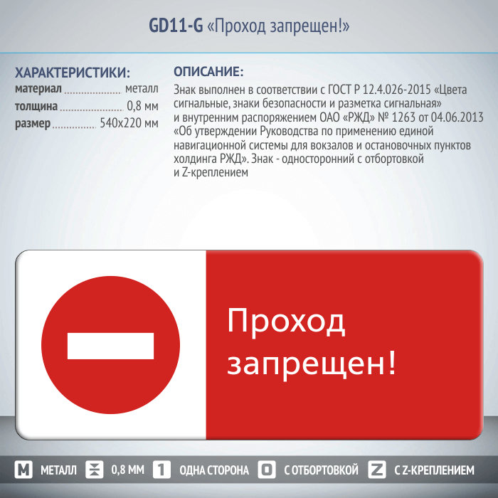 Знак «Проход запрещен!», GD11-G (односторонний горизонтальный, 540х220 мм, металл, с отбортовкой и Z-креплением) в Бердске купить