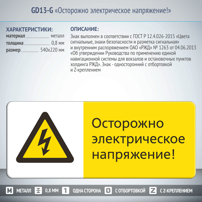 Знак «Осторожно электрическое напряжение!», GD13-G (односторонний горизонтальный, 540х220 мм, металл, с отбортовкой и Z-креплением) в Бердске купить