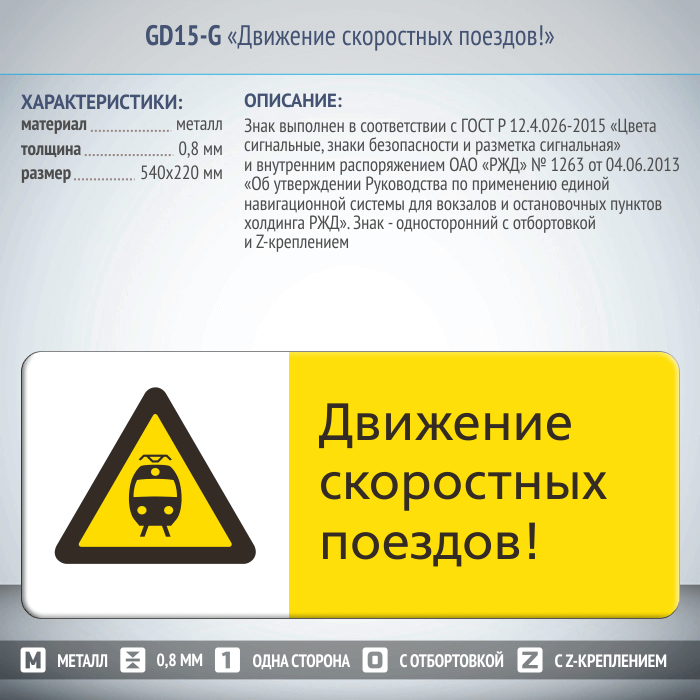 Знак «Движение скоростных поездов!», GD15-G (односторонний горизонтальный, 540х220 мм, металл, с отбортовкой и Z-креплением) в Бердске купить