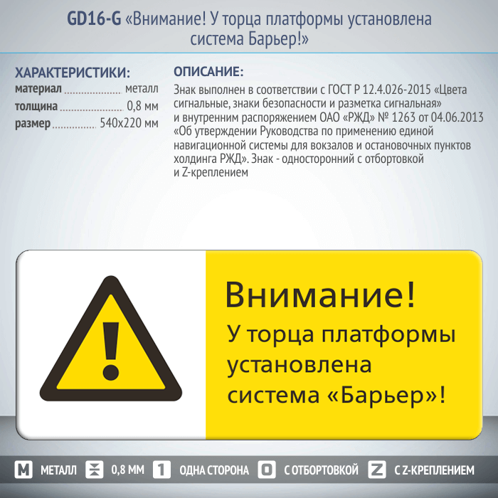 Знак «Внимание! У торца платформы установлена система Барьер!», GD16-G (односторонний горизонтальный, 540х220 мм, металл, с отбортовкой и Z-креплением) в Бердске купить
