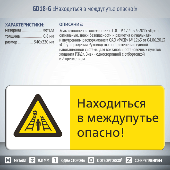Знак «Находиться в междупутье опасно!», GD18-G (односторонний горизонтальный, 540х220 мм, металл, с отбортовкой и Z-креплением) в Бердске купить
