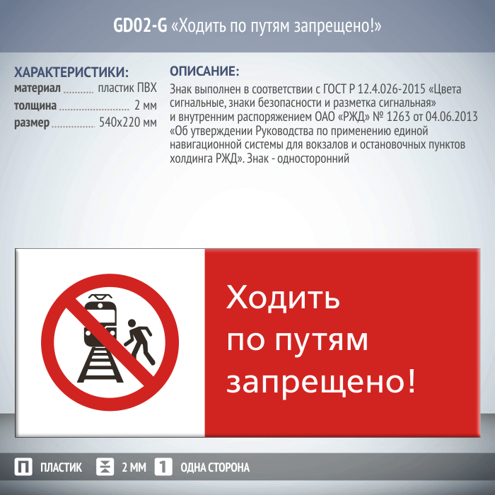 Знак «Ходить по путям запрещено!», GD02-G (односторонний горизонтальный, 540х220 мм, пластик 2 мм) в Бердске купить