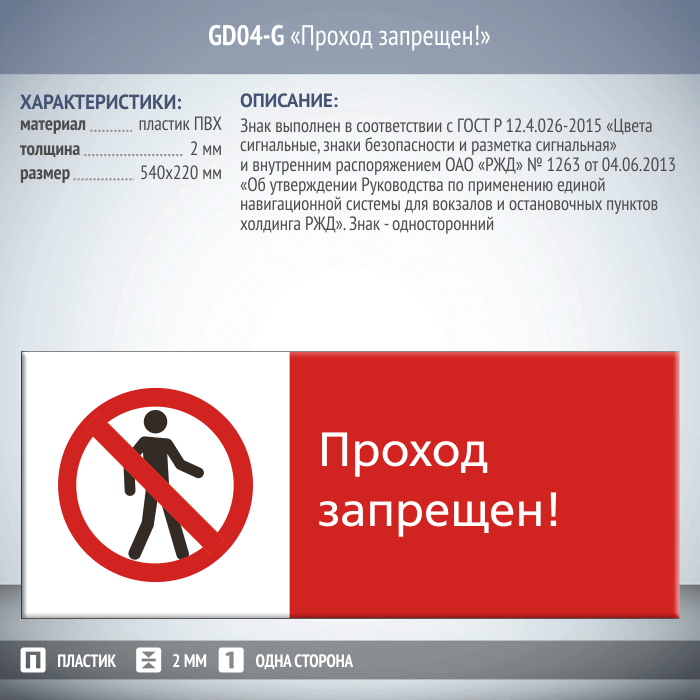 Знак «Проход запрещен!», GD04-G (односторонний горизонтальный, 540х220 мм, пластик 2 мм) в Бердске купить