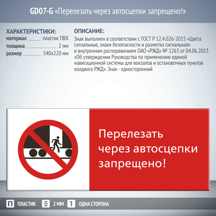 Знак «Перелезать через автосцепки запрещено!», GD07-G (односторонний горизонтальный, 540х220 мм, пластик 2 мм) в Бердске купить