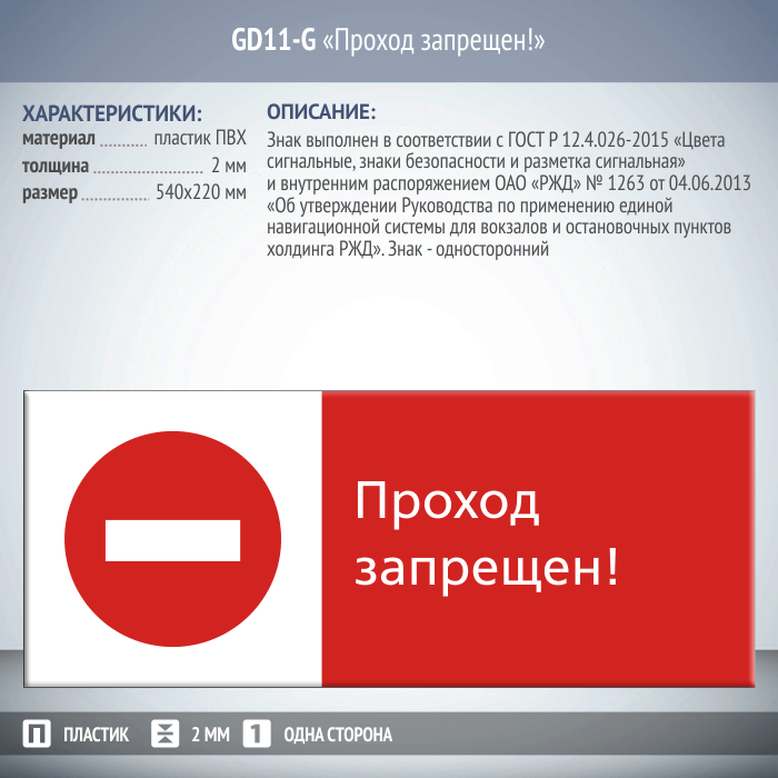 Знак «Проход запрещен!», GD11-G (односторонний горизонтальный, 540х220 мм, пластик 2 мм) в Бердске купить