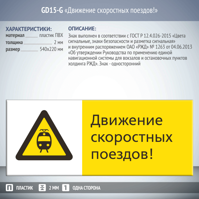 Знак «Движение скоростных поездов!», GD15-G (односторонний горизонтальный, 540х220 мм, пластик 2 мм) в Бердске купить