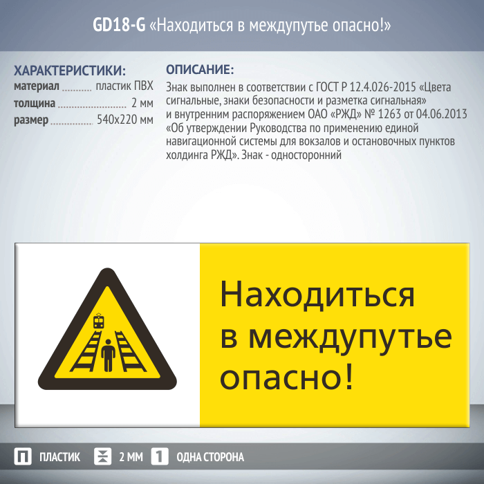 Знак «Находиться в междупутье опасно!», GD18-G (односторонний горизонтальный, 540х220 мм, пластик 2 мм) в Бердске купить
