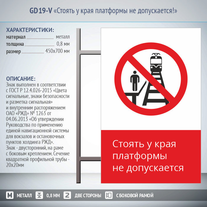 Знак «Стоять у края платформы не допускается!», GD19-V (двусторонний вертикальный, 450х700 мм, металл, на раме с боковым креплением) в Бердске купить