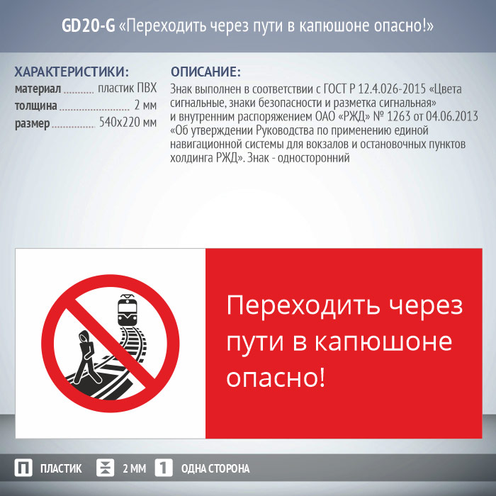Знак «Переходить через пути в капюшоне опасно!», GD20-G (односторонний горизонтальный, 540х220 мм, пластик 2 мм) в Бердске купить