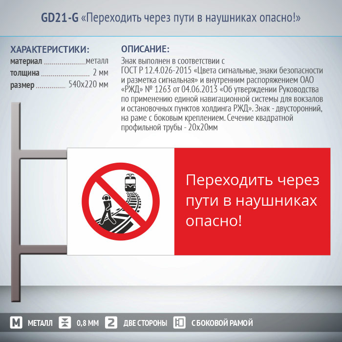 Знак «Переходить через пути в наушниках опасно!», GD21-G (двусторонний горизонтальный, 540х220 мм, металл, на раме с боковым креплением) в Бердске купить
