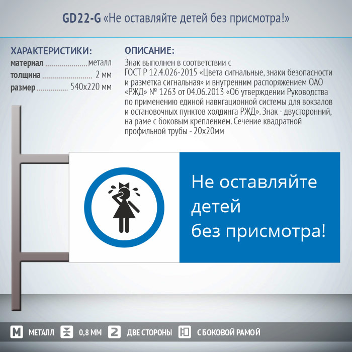 Знак «Не оставляйте детей без присмотра!», GD22-G (двусторонний горизонтальный, 540х220 мм, металл, на раме с боковым креплением) в Бердске купить