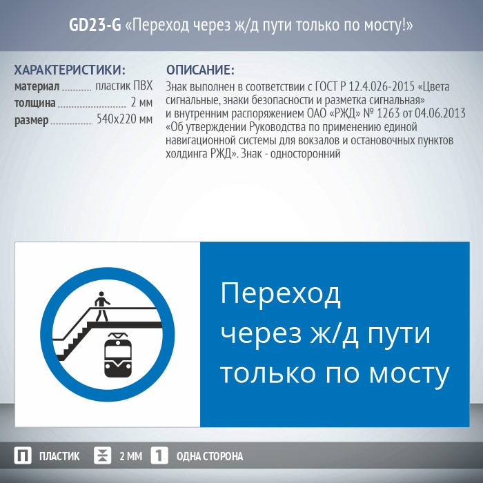 Знак «Переход через ж/д пути только по мосту!», GD23-G (односторонний горизонтальный, 540х220 мм, пластик 2 мм) в Бердске купить