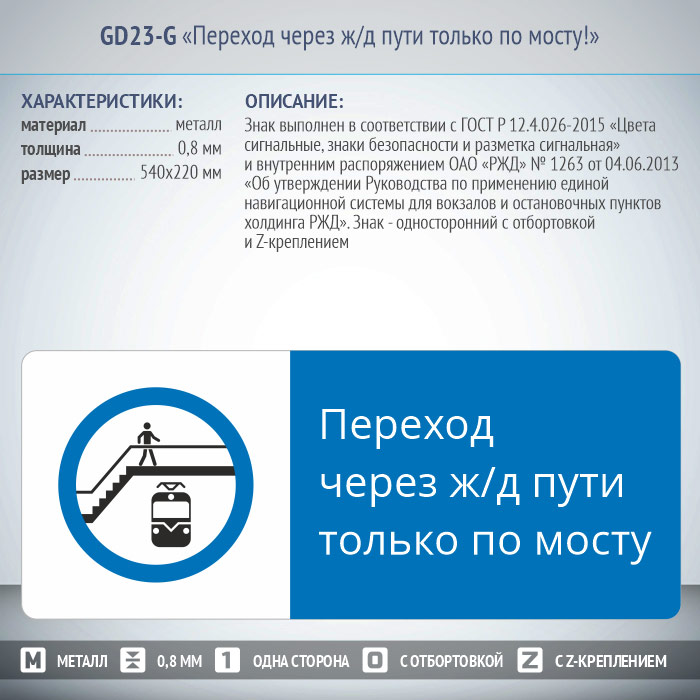 Знак «Переход через ж/д пути только по мосту!», GD23-G (односторонний горизонтальный, 540х220 мм, металл, с отбортовкой и Z-креплением) в Бердске купить
