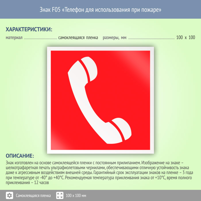 Знак F05 «Телефон для использования при пожаре (в том числе телефон прямой связи с пожарной охраной)» (пленка, 100х100 мм) в Бердске купить